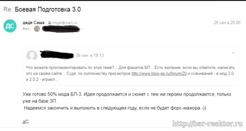 Ходили слухи о том, что идёт работа над модификацией Боевая Подготовка 3.0 и я решил узнать у Дядя Саши, правда это или только слухи... Написал письмо на его электронный ящик и получил краткий ответ: